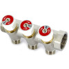 Коллектор из латуни НВ 3/4 на 3 выхода 1/2, под плоскую прокладку, межосевое расстояние 40 мм, никелированный, с вентилями Uni-fitt
